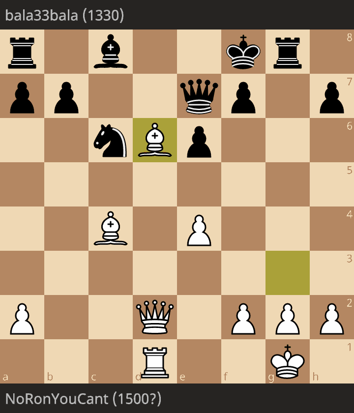 NoRonYouCant (1500?) played bala33bala (1330) in a rated Rapid (10+0) game of chess. bala33bala resigned after 25 moves. Click to replay, analyse, and discuss the game!